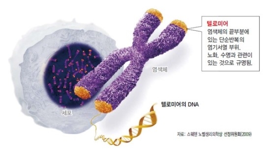 DNA 다발의 끝에 있는 텔로미어는 세포가 분열할 때마다 짧아지며, 이는 노화의 중요한 원인이자 결과입니다.